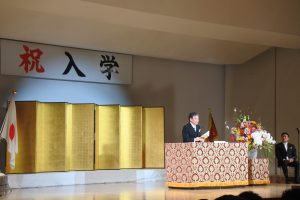 す。学校長からの式辞、生徒会執行部代表からの歓迎の言葉が送られました。