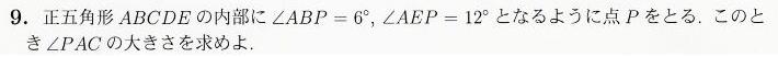 | 右図のように五角形の外部に、辺AEを1辺とする正三角形AEFを作る。 このとき、∠BAE=108°なので、∠BAF=168°。 三角形ABFはAB=AFの二等辺三角形であるので、∠ABF=∠AFB=6° よって、点PはBF上にある。 ∠AEP=12°となるように点Pを辺BF上に取れば、右図のようになり、このとき、∠PACを求めればよい。 ∠PEF=60°+12°=72°、∠EFP=60°-6°=54° ∠FPE=180°-72°-54°=54° ∠EPF=∠EFPより、三角形EFPは二等辺三角形 ∴ EF=EP …@ 三角形EFPは正三角形なのでEF=EA …A @AよりEA=EP ∴ ∠EAP=(180°-12°)÷2=84° ∴ ∠BAP=108°-84°=24° ∠BAC=(180°-108°)÷2=36° ∠PAC=∠BAC-∠BAP=36°-24°=12° |